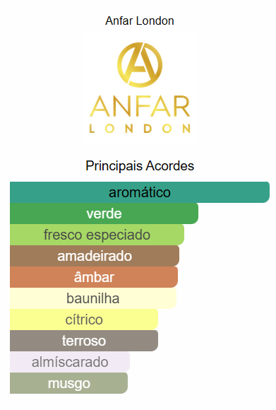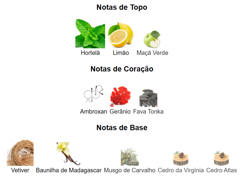 Esta fragrância requintada revela uma mistura harmoniosa de menta refrescante, maçã verde crocante e limão picante nas notas de topo. À medida que se desdobra, o coração revela um acorde sofisticado de fava tonka, ambroxan e gerânio. As notas de base permanecem com o calor da baunilha de Madagascar, do cedro da Virgínia, do cedro do Atlas, do vetiver e do musgo de carvalho, deixando um rastro de sofisticação sedutora.