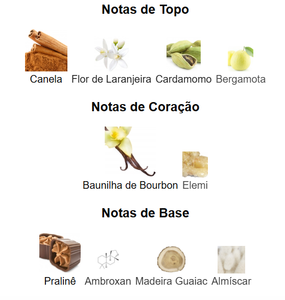 As notas de topo: canela, flor de laranjeira, cardamomo e bergamota.