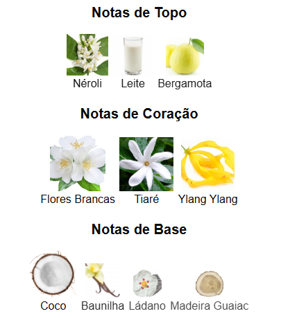Notas de coração: ylang-ylang, flores brancas e flor de tiare.