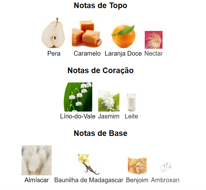 Notas de fundo: Baunilha, almíscar, âmbar.