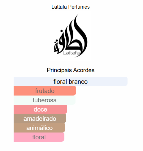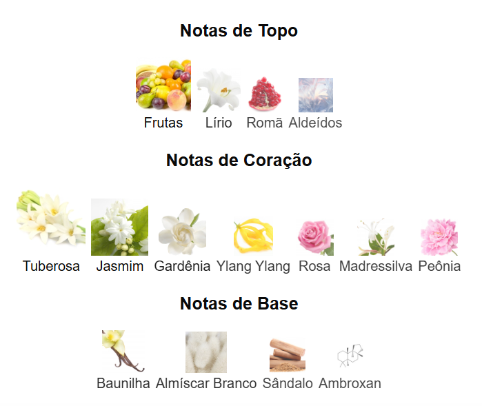 Notas de coração: Tuberosa, Jasmim, Gardênia, Ylang-Ylang, Madressilva, Peônia e Rosa.