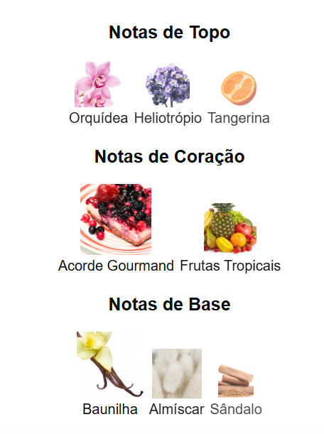 Notas de coração: Acorde Gourmand e Frutas Tropicais.