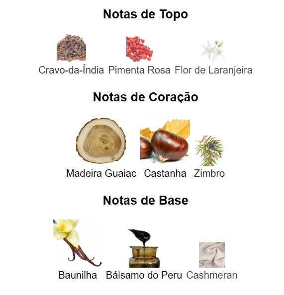 As notas de coração: Castanha, Madeira de Guaiac e Zimbro.
