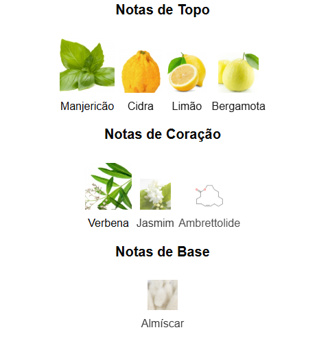 As notas de cabeça: Manjericão, bergamota, cidra italiana, limão.