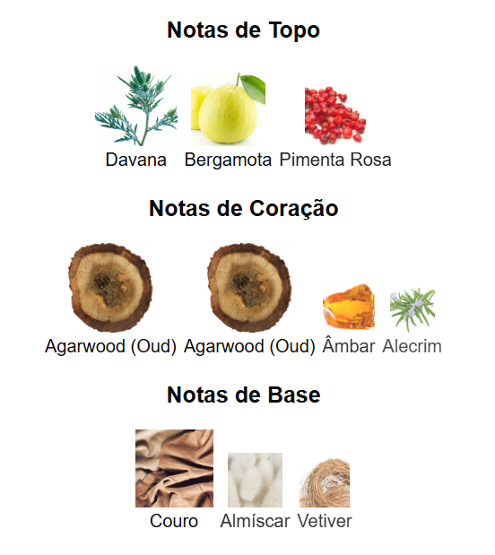 As notas de coração: Agarwood, Oud, Amber e Rosemary.