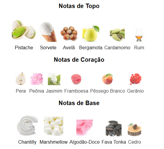 As notas de topo são: Pistache, Sorvete, Avelã, Bergamota, Cardamomo e Rum.