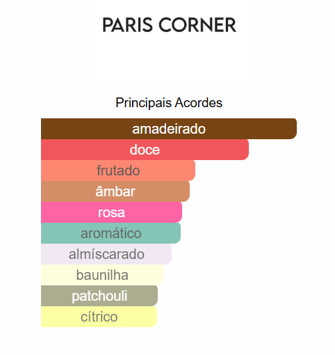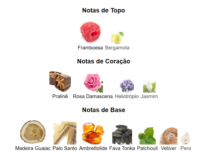 As notas de fundo: madeira gaiac, pau-rosa, ambrettolide, fava tonka, patchouli, vetiver e pera.