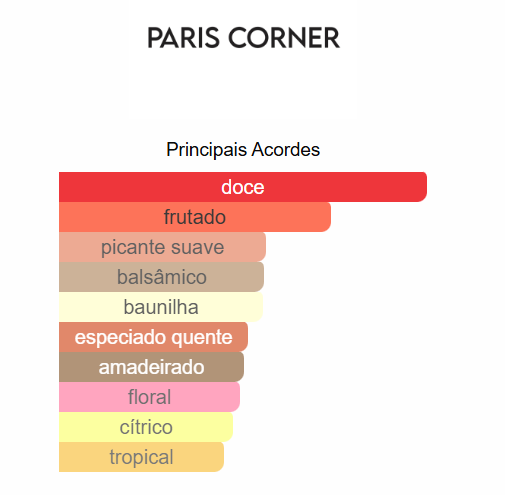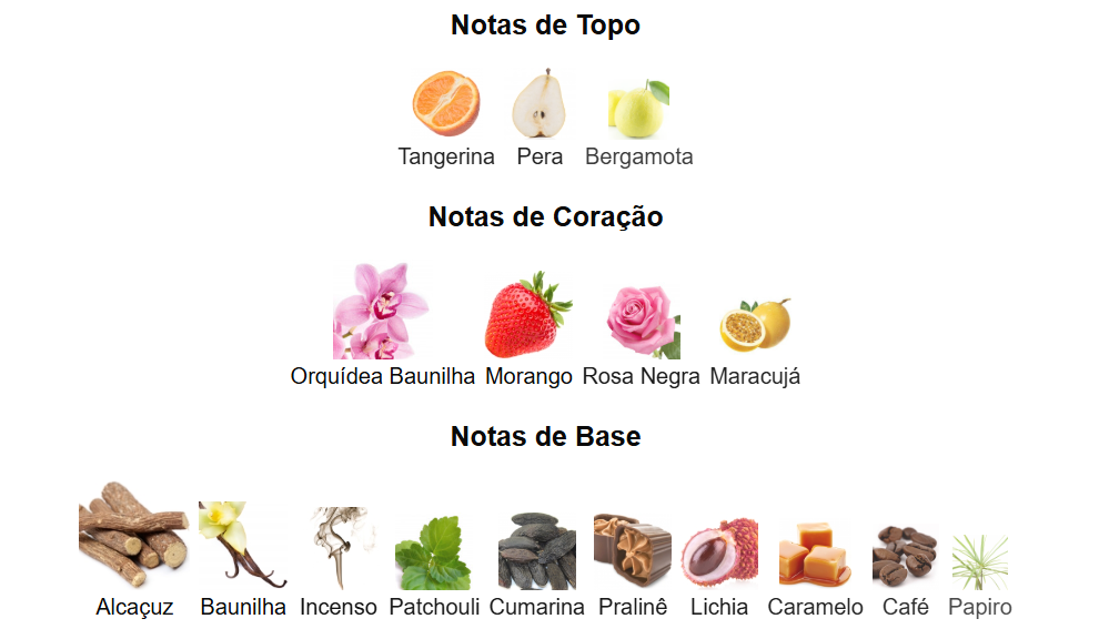 As notas de base: Praliné, Caramelo, Lichia, Patchouli, Baunilha, Incenso, Café, Alcaçuz, Cumarina e Papiro.